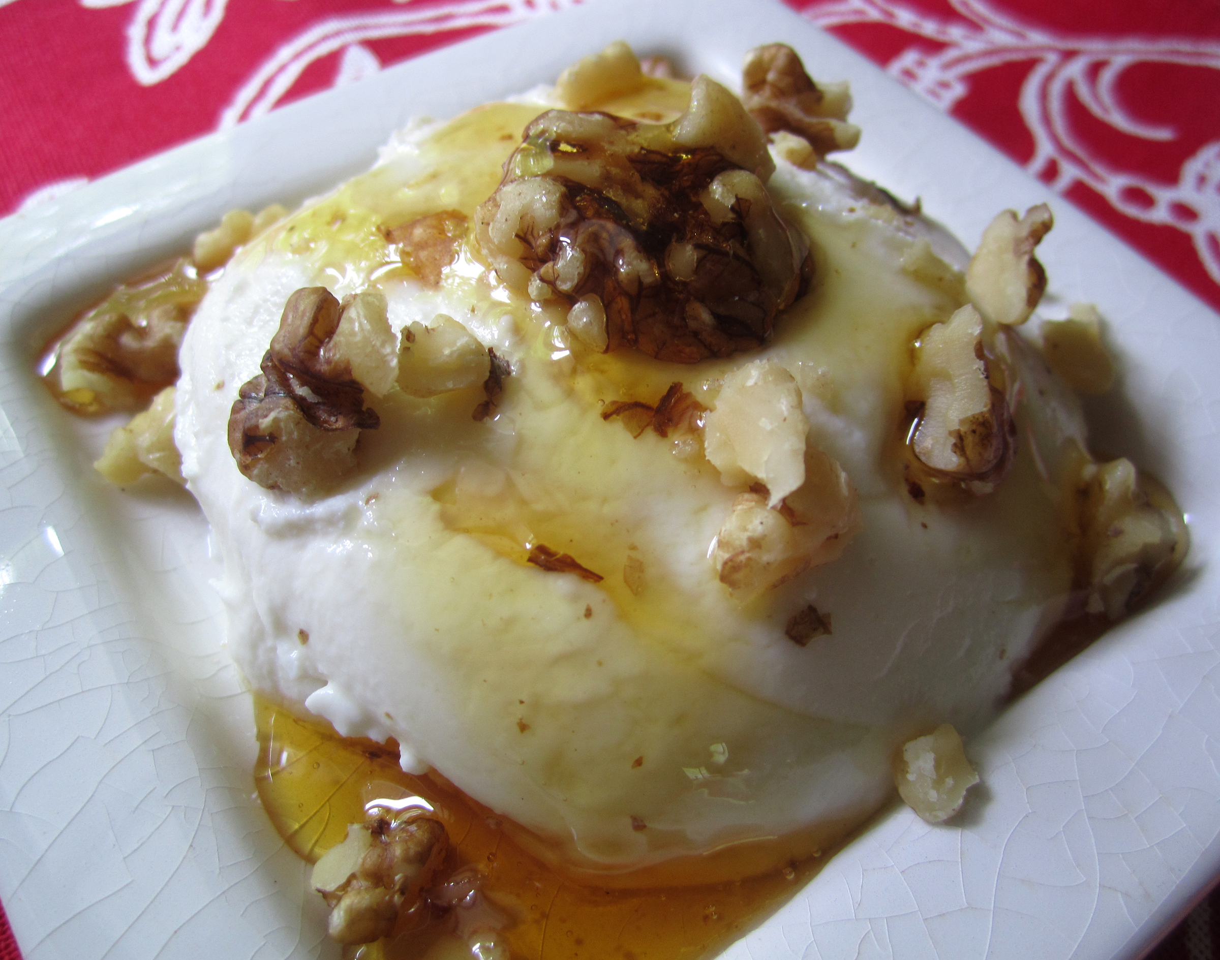 I’ve been into making easy, light and yummy desserts lately. This may be the easiest of all. Here is an excerpt from Wikipedia about Mel i Mato: Mató (Catalan pronunciation: [məˈto]) is a Catalan fresh cheese made from cows’ or goats’ milk, with no salt added. It is usually served with honey, as a dessert, called mel i mató. Mató appeared in the Sent Soví, a Catalan cookbook from the 14th century. It was very popular during the Middle Ages, when it was made plain or scented with orange flowers.