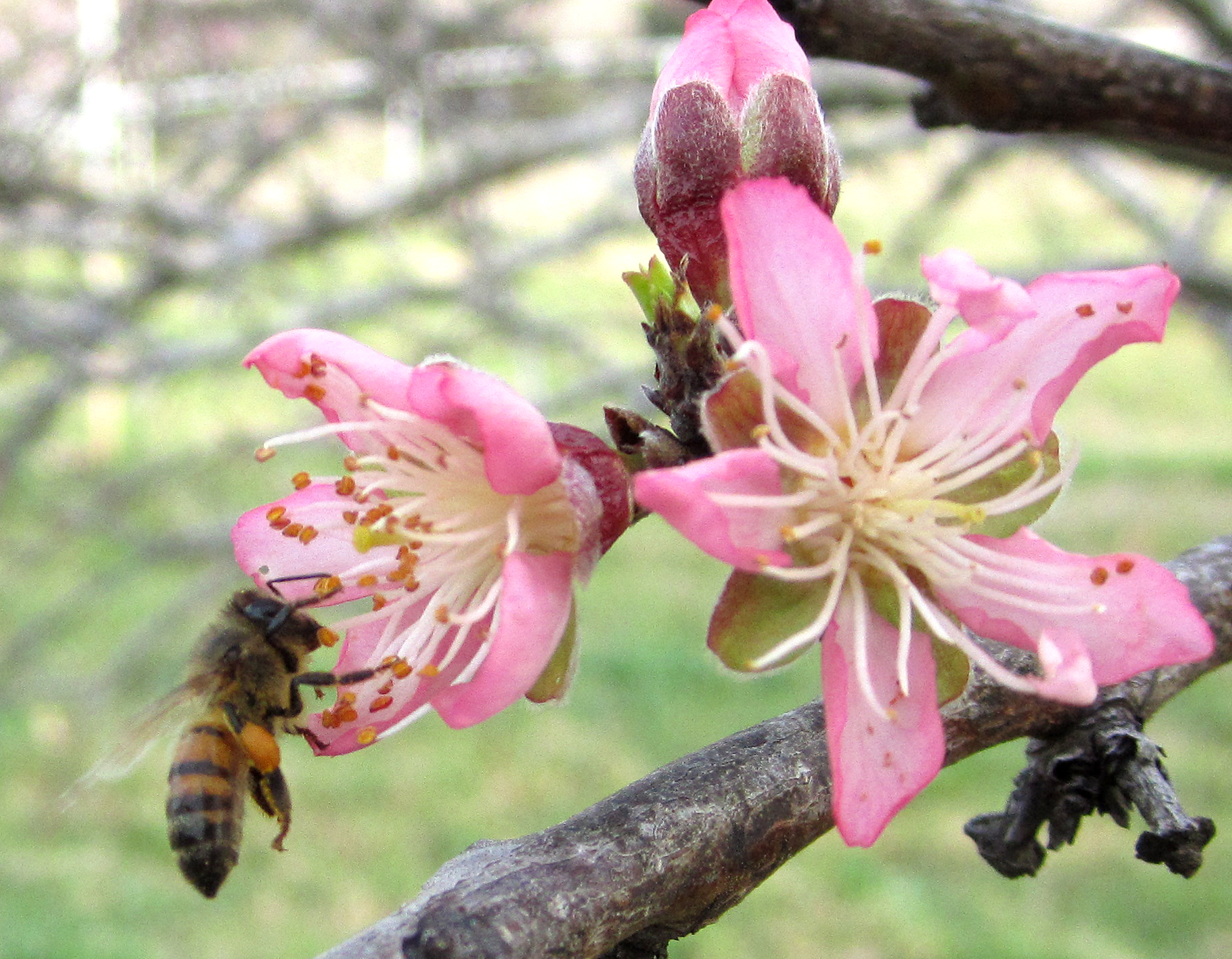 This afternoon however, the sun came out, it warmed up into the mid 70’s and the wind was still blowing.  I left school as quickly as possible and hurried home to go see what they were up to.  I’d noticed yesterday that the peach trees are blooming and I was curious to see if the bees had come out and found them.